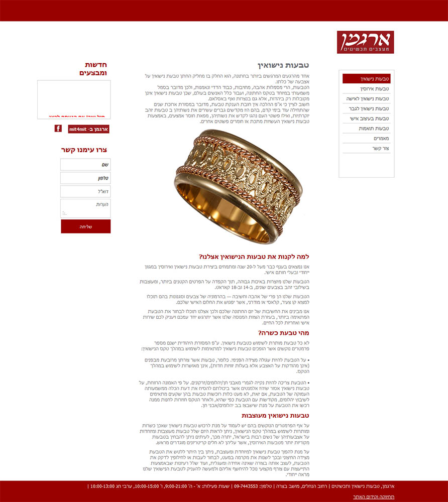 חברת ארגמן הינה חברה המעצבת תכשיטים ומתמחה בתחום הטבעות אירוסיו ונישואין. בזכות עיצוב נכון של האתר ניתן להסיק כי החברה בעלת ידע רב וניסיון בתחום הטבעות ובעלת מגוון רחב של סוגי טבעות שיותאמו לכל אחד.