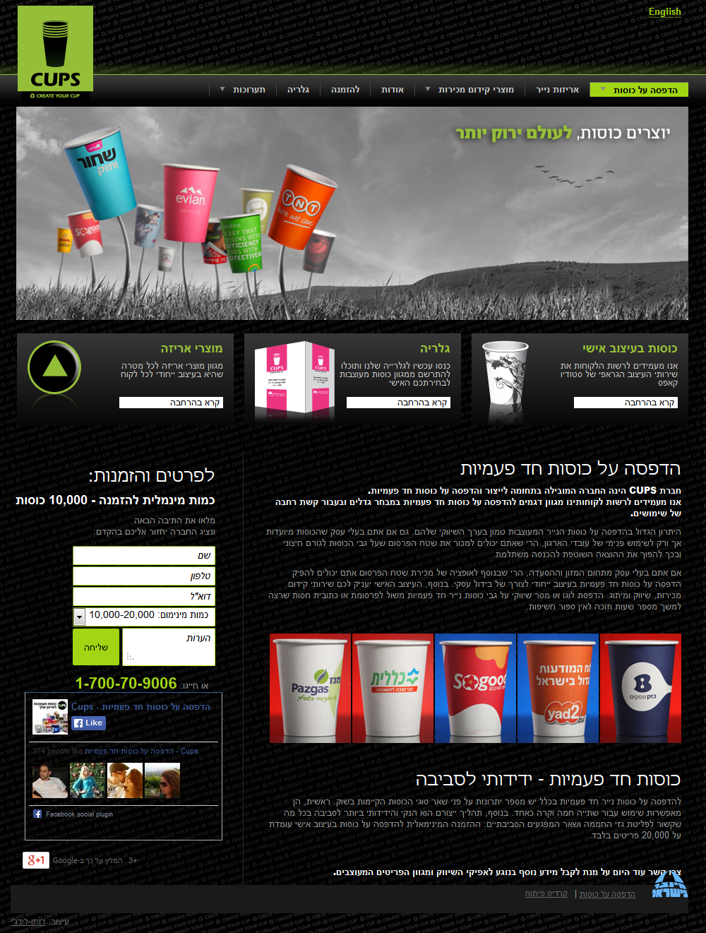 צבעי האתר הייחודיים, לבן וירוק בהיר על גבי שחור, יוצרים לו רושם מיוחד מאוד, ומקצועי מאוד. עיצוב זה מתאים מאוד גם לשירות הייחודי שמספקת החברה- ההדפסה על כוסות חד פעמיות. התמונה הראשית, המפויעה מראש כל עמוד, מרהיבה מאוד, מתאימה לשאר העיצוב של האתר ומספקת המחשה יפה לישורת המעניין הזה.
